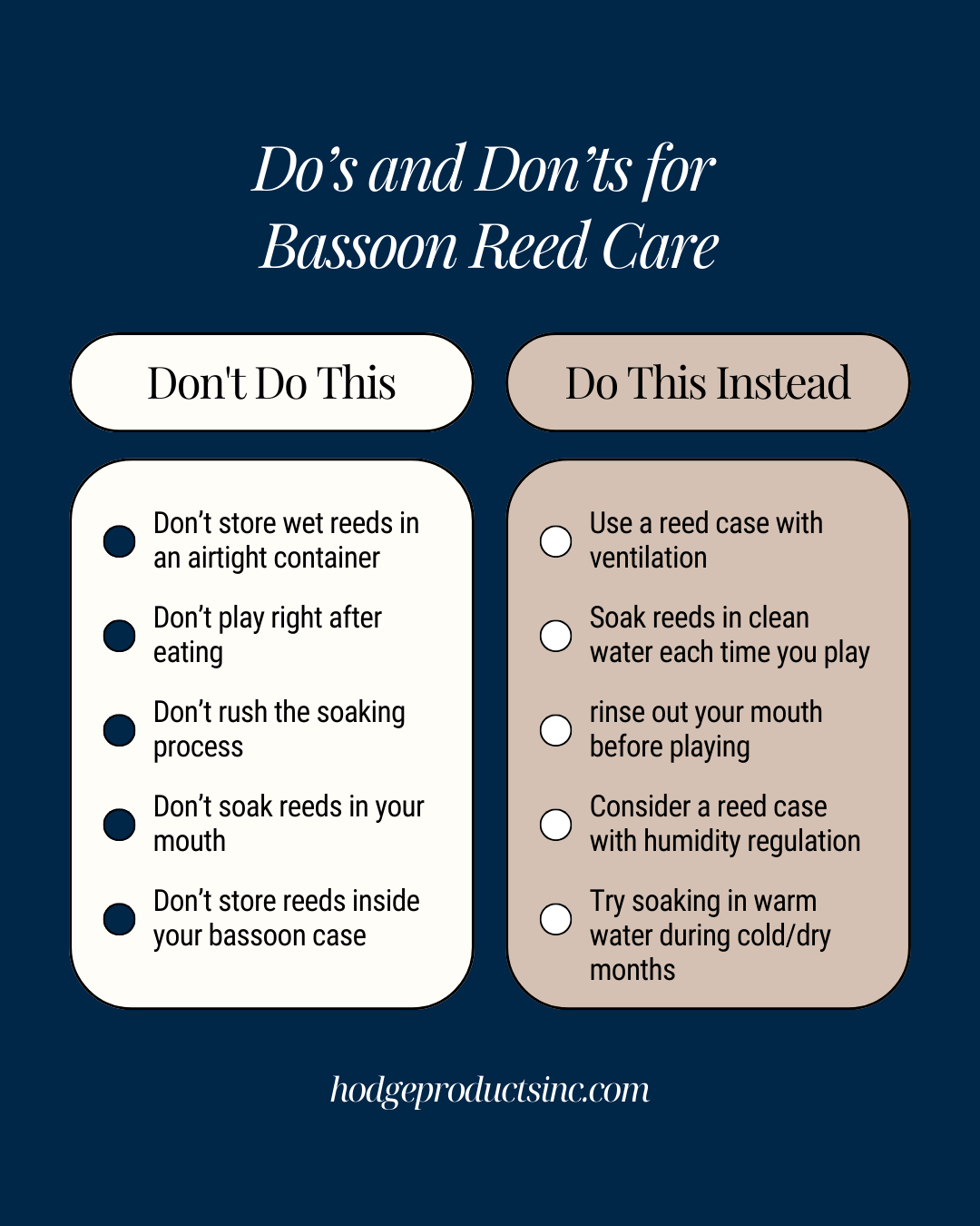 Below is a summary of the do’s and don’ts of bassoon reed care.